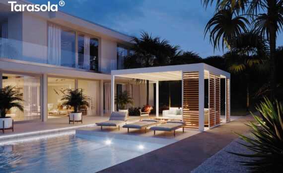 Solidna konstrukcja, kubiczna bryła, minimalistyczny i nowoczesny design to cechycharakterystyczne Tarasoli Cubic. Jest to zadaszenie, które łączy w sobie estetykęwykonania i odporność na niekorzystne warunki atmosferyczne, takie jak opady deszczu,nadmierne słońce, a nawet śnieg, co zapewnia komfort użytkowania.Zadaszenie występuje w dwóch wersjach: wolnostojącej i przyściennej, dzięki czemu zpowodzeniem wpisuje się w zróżnicowane gusta oraz zagospodarowanie przestrzeni. Cowięcej, ma ono charakter modułowy pozwalający na rozbudowę, co sprawia, że jest onaciekawym rozwiązaniem dla branży HoReCa. Każdy z modułów ma osobne poszycie.Nowy, dwuwarstwowy dach z napiętą tkaniną sprawia, że tarasola jest spójną designerskokonstrukcją, tworząc geometryczną formę. Dopełnieniem jest pełna automatyka, któragwarantuje sprawne i wygodne sterowanie elementami takimi jak rolety, promienniki ciepła,czy oświetlenie, które w tym modelu może być umieszczone liniowo na całej szerokościdachu.